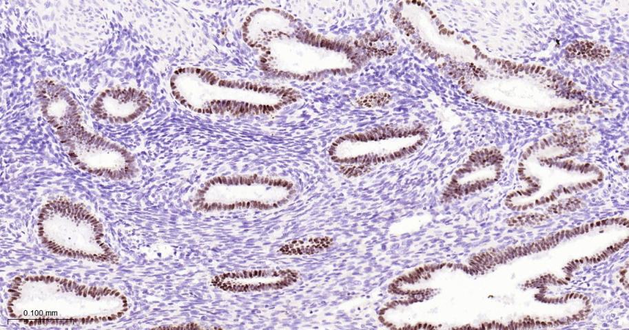 Paraformaldehyde-fixed, paraffin embedded Human uterus; Antigen retrieval by boiling in sodium citrate buffer (pH6.0) for 15 min; Antibody incubation with PAX8 Monoclonal Antibody, Unconjugated(bsm-52737R) at 1:200 overnight at 4°C, followed by conjugation to the bs-0295G-HRP and DAB (C-0010) staining.