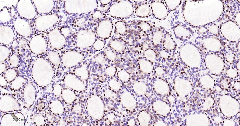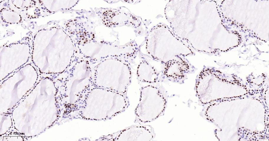 Paraformaldehyde-fixed, paraffin embedded Rat thyroid gland; Antigen retrieval by boiling in sodium citrate buffer (pH6.0) for 15 min; Antibody incubation with PAX8 Monoclonal Antibody, Unconjugated(bsm-52737R) at 1:200 overnight at 4°C, followed by conjugation to the bs-0295G-HRP and DAB (C-0010) staining.