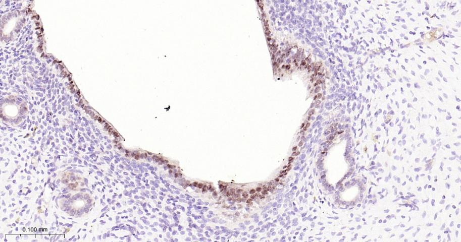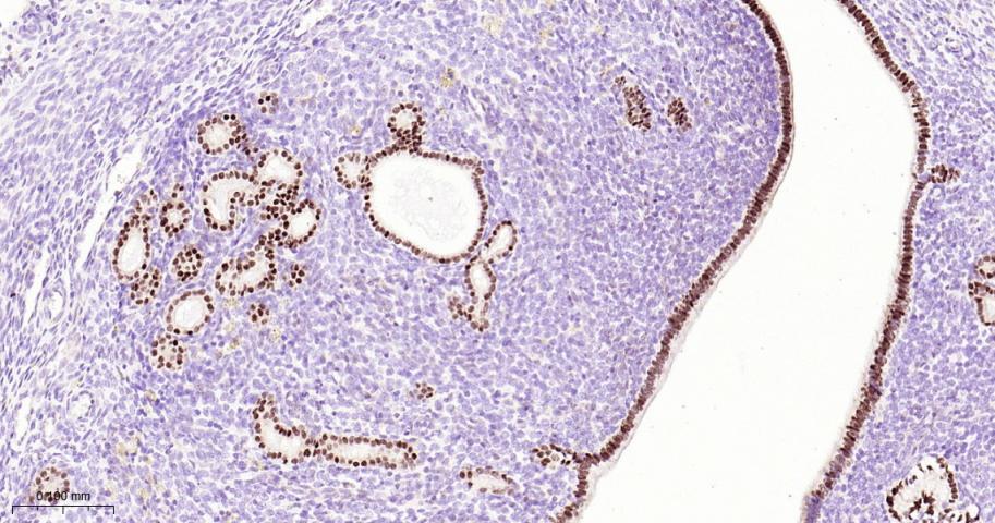 Paraformaldehyde-fixed, paraffin embedded Rat uterus; Antigen retrieval by boiling in sodium citrate buffer (pH6.0) for 15 min; Antibody incubation with PAX8 Monoclonal Antibody, Unconjugated(bsm-52737R) at 1:200 overnight at 4°C, followed by conjugation to the bs-0295G-HRP and DAB (C-0010) staining.