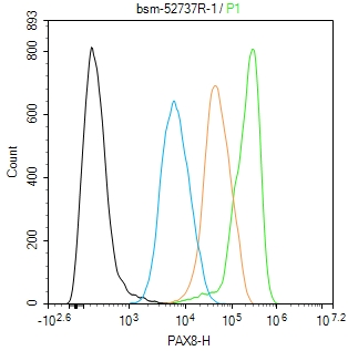 The OVCAR-3 (H) cells were fixed with 4% PFA (10 min at r.t.) and then permeabilized with 90% ice-cold methanol for 20 min at -20℃,the cells then were incubated in 5%BSA to block non-specific protein-protein interactions (30 min at r.t.).Primary Antibody (green):Rabbit Anti-PAX8 antibody (bsm-52737R,1:100); Secondary Antibody (white blue): Goat anti-Rabbit IgG-BF488 (bs-60295G-BF488): 1 μg/test. Isotype Control (orange): Rabbit IgG (bs-0295P). Blank control (black): PBS. Acquisition of 20,000 events was performed.