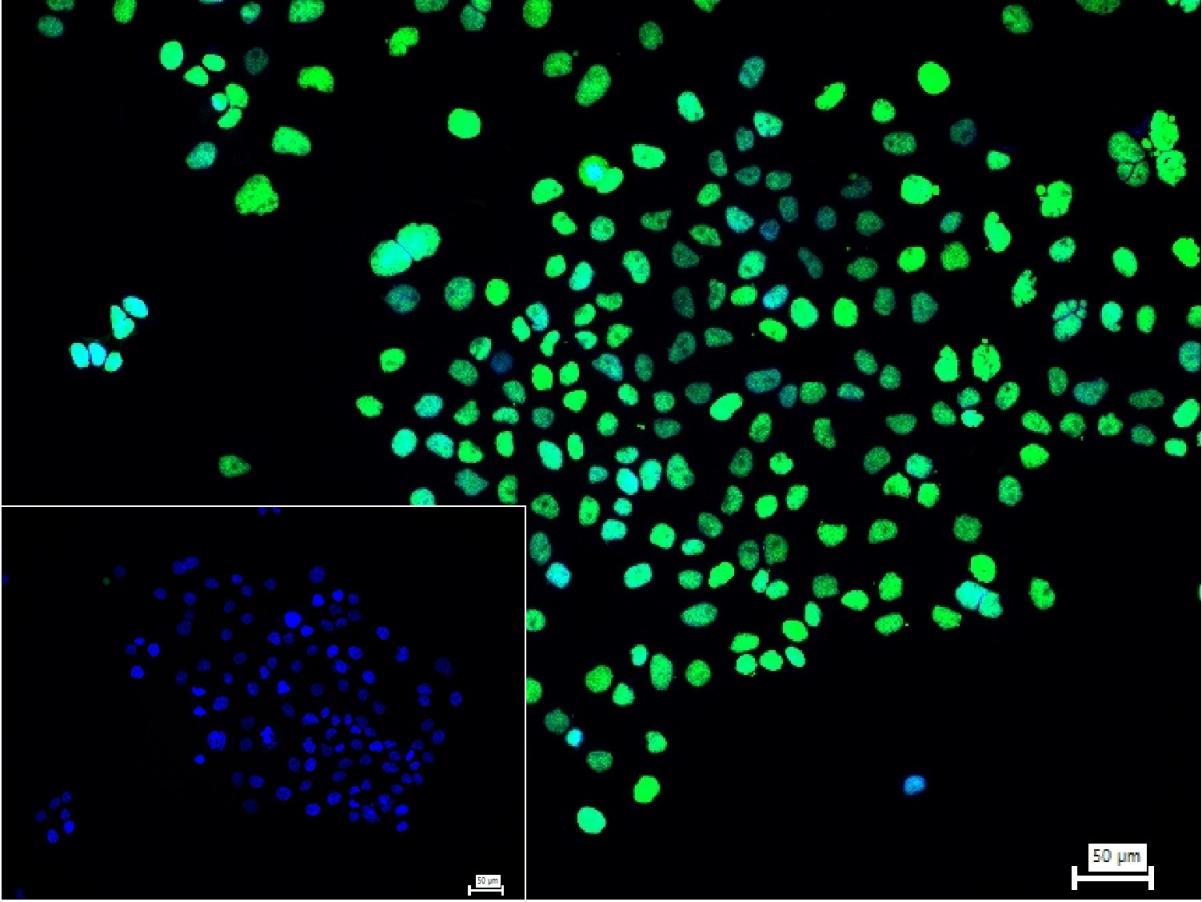 4% Paraformaldehyde-fixed OVCAR-3 (H) cell; Triton X-100 at r.t. for 20 min; Antibody incubation with (PAX8) monoclonal Antibody, unconjugated (bsm-52737R) 1:100, 90 min at 37°C; followed by conjugated Goat Anti-Rabbit IgG antibody (green, bs-60295G-BF488) at 37°C for 90 min, DAPI (blue, C02-04002) was used to stain the cell nuclei. PBS instead of the primary antibody was used as the blank control.