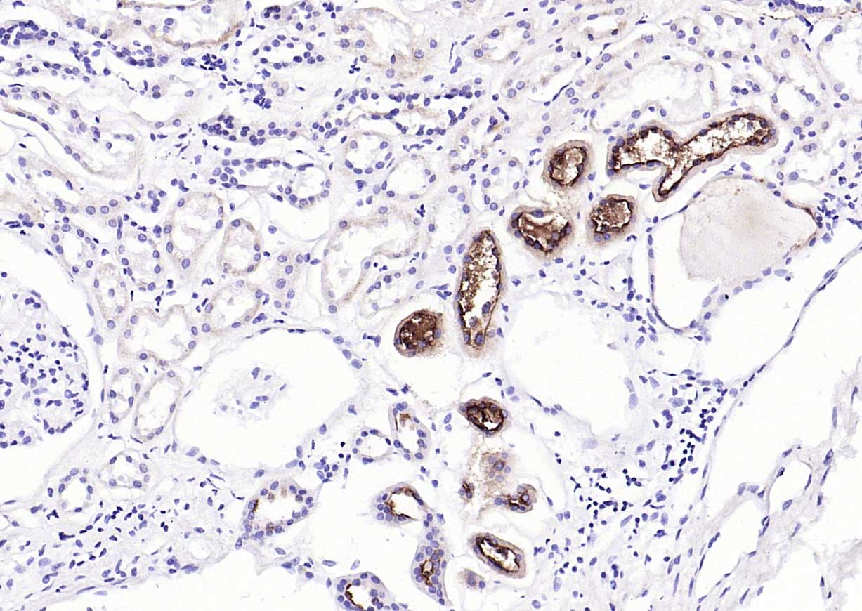Paraformaldehyde-fixed, paraffin embedded (human kidney); Antigen retrieval by boiling in sodium citrate buffer (pH6.0) for 15min; Block endogenous peroxidase by 3% hydrogen peroxide for 20 minutes; Blocking buffer (normal goat serum) at 37°C for 30min; Incubation with (Mucin-1) Monoclonal Antibody, Unconjugated (bsm-41732M) at 1:200 overnight at 4°C, followed by operating according to SP Kit(Mouse)(sp-0024) instructionsand DAB staining.