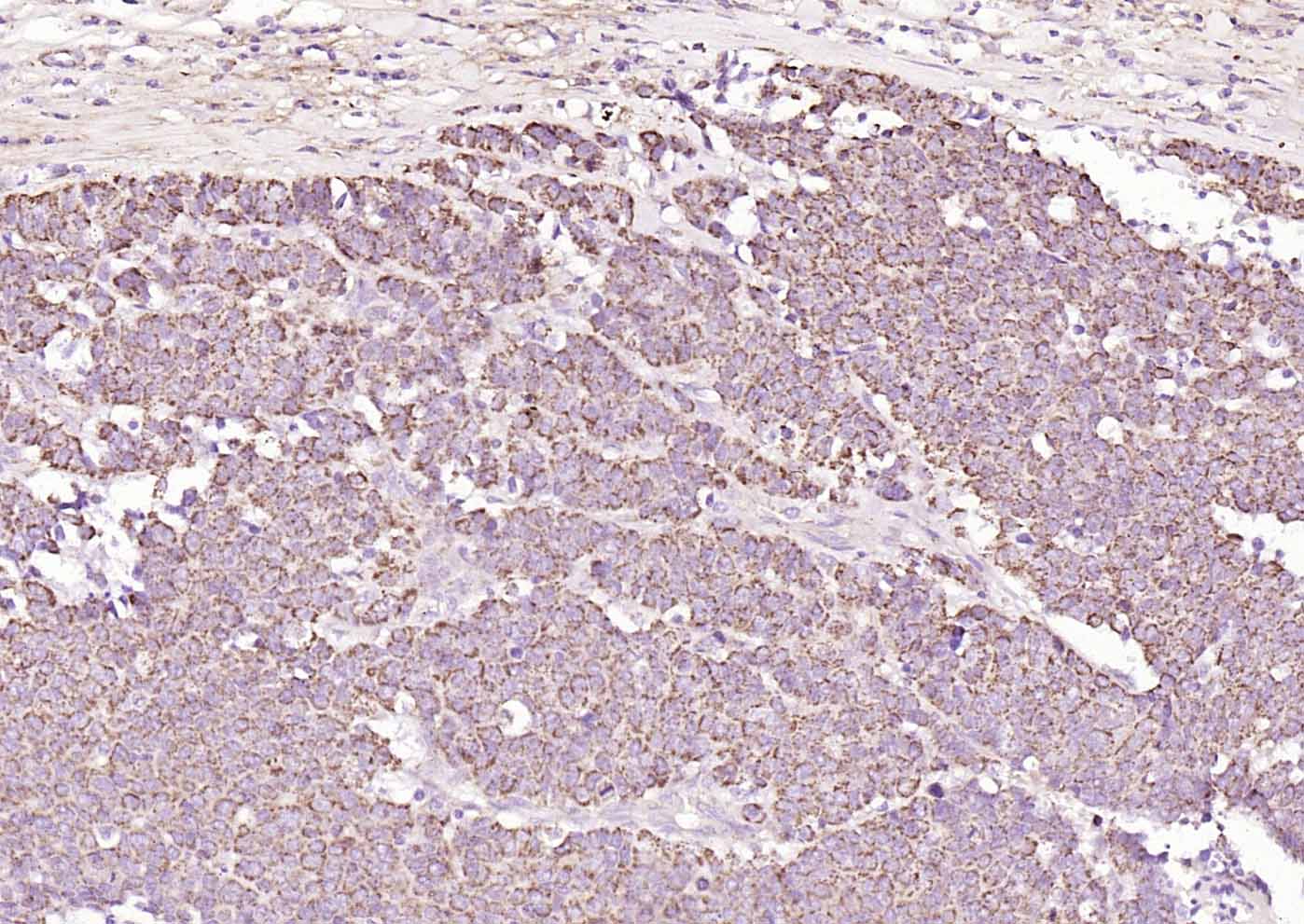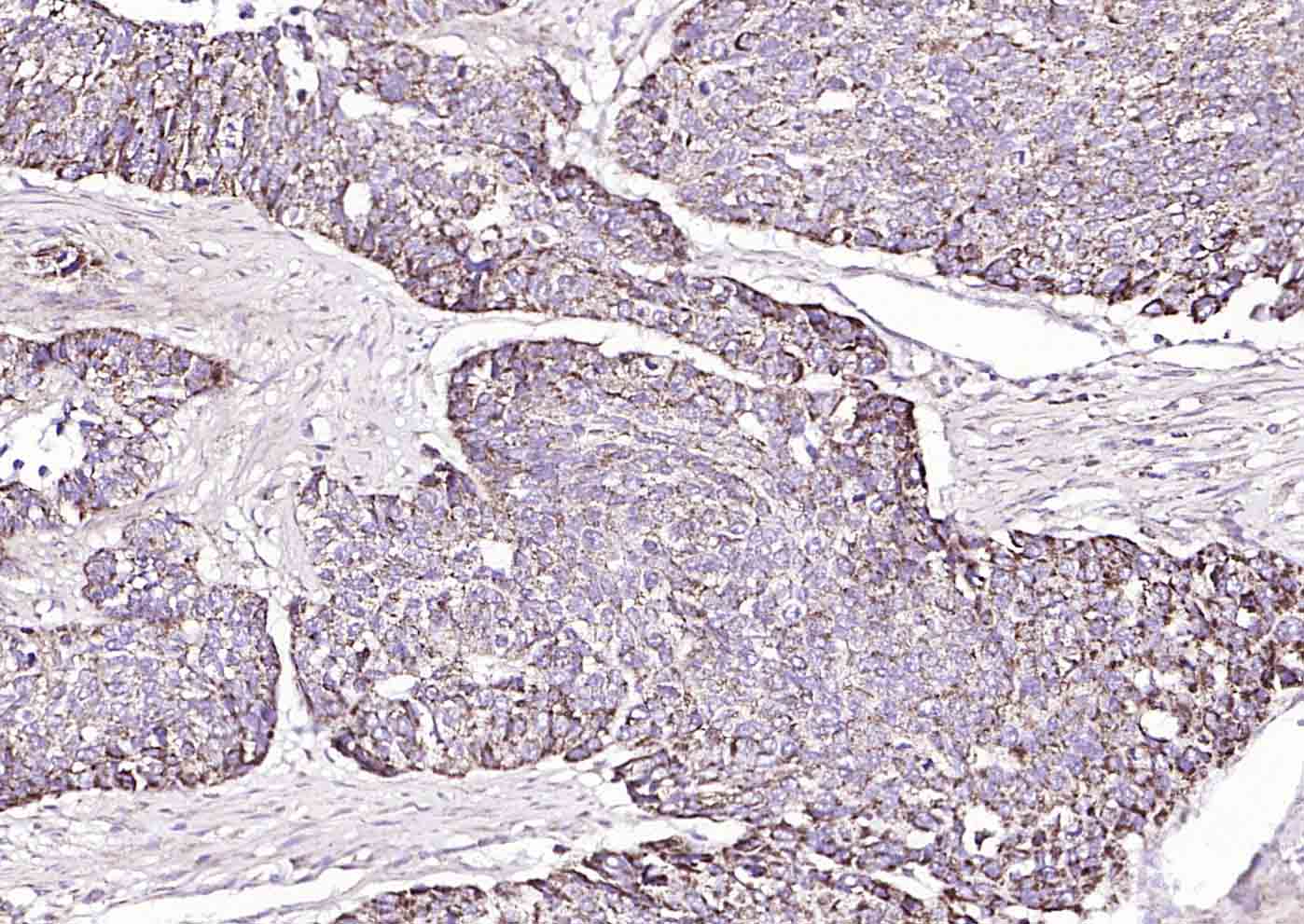 Paraformaldehyde-fixed, paraffin embedded (human lung carcinoma); Antigen retrieval by boiling in sodium citrate buffer (pH6.0) for 15min; Block endogenous peroxidase by 3% hydrogen peroxide for 20 minutes; Blocking buffer (normal goat serum) at 37°C for 30min; Incubation with (TRPM8) Polyclonal Antibody, Unconjugated (bs-25330R) at 1:200 overnight at 4°C, followed by operating according to SP Kit(Rabbit) (sp-0023) instructionsand DAB staining.