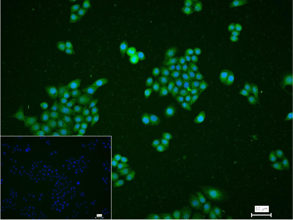 4% Paraformaldehyde-fixed MCF-7 (H) cell; Triton X-100 at r.t. for 20 min; Antibody incubation with (HES1) polyclonal Antibody, unconjugated (bs-41372R) 1:100, 90 min at 37°C; followed by conjugated Goat Anti-Rabbit IgG antibody (green, bs-40295G-FITC) at 37°C for 90 min, DAPI (blue, C02-04002) was used to stain the cell nuclei. PBS instead of the primary antibody was used as the blank control.