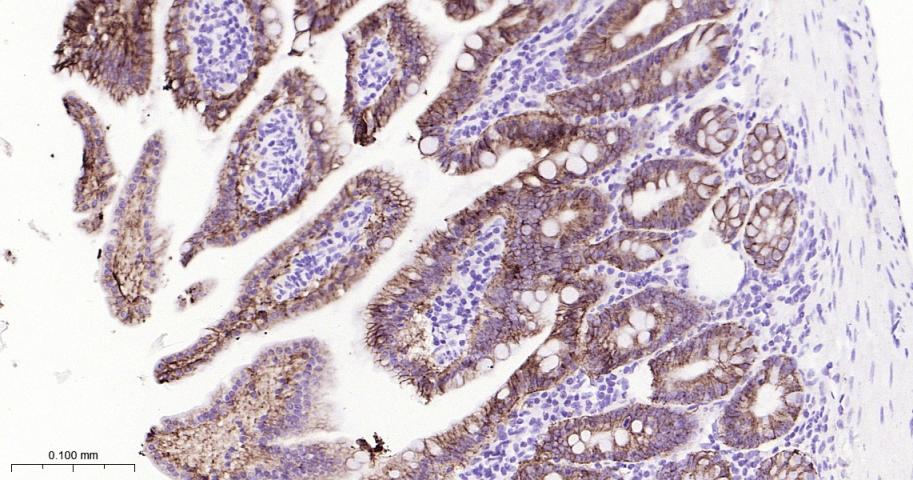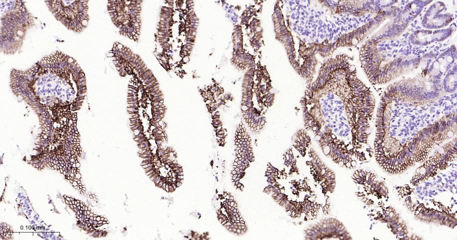 Paraformaldehyde-fixed, paraffin embedded Mouse Small Intestine; Antigen retrieval by boiling in sodium citrate buffer (pH6.0) for 15 min; Antibody incubation with CDH17/LI-cadherin Monoclonal Antibody, Unconjugated(bsm-60434R) at 1:200 overnight at 4°C, followed by conjugation to the bs-0295G-HRP and DAB (C-0010) staining.