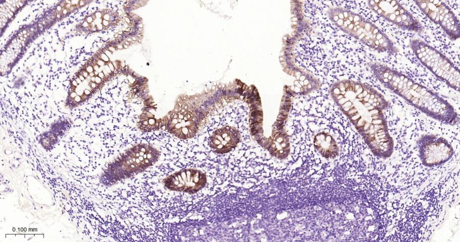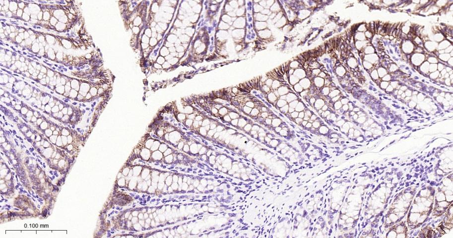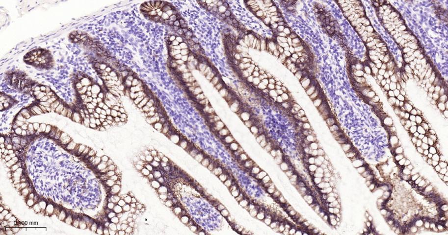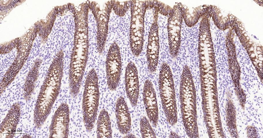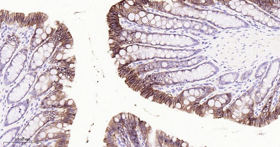Paraformaldehyde-fixed, paraffin embedded Mouse Colon; Antigen retrieval by boiling in sodium citrate buffer (pH6.0) for 15 min; Antibody incubation with CDH17/LI-cadherin Monoclonal Antibody, Unconjugated(bsm-60434R) at 1:200 overnight at 4°C, followed by conjugation to the bs-0295G-HRP and DAB (C-0010) staining.
