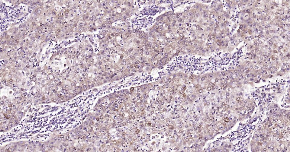 Paraformaldehyde-fixed, paraffin embedded Human Liver; Antigen retrieval by boiling in sodium citrate buffer (pH6.0) for 15 min; Antibody incubation with ACLY Monoclonal Antibody, Unconjugated(bsm-52458R) at 1:200 overnight at 4°C, followed by conjugation to the SP Kit(Rabbit, SP-0023) and DAB (C-0010) staining.