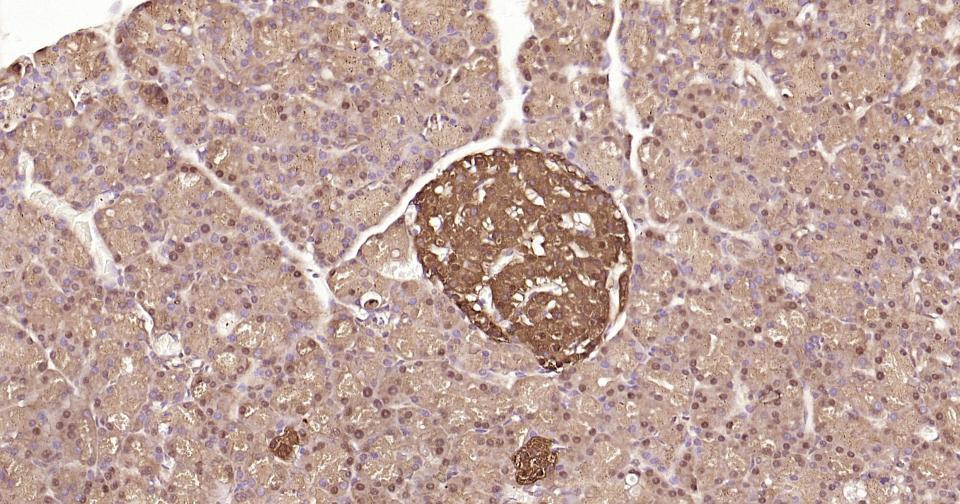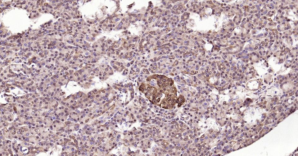 Paraformaldehyde-fixed, paraffin embedded Rat Pancreas; Antigen retrieval by boiling in sodium citrate buffer (pH6.0) for 15 min; Antibody incubation with ACLY Monoclonal Antibody, Unconjugated(bsm-52458R) at 1:200 overnight at 4°C, followed by conjugation to the SP Kit(Rabbit, SP-0023) and DAB (C-0010) staining.