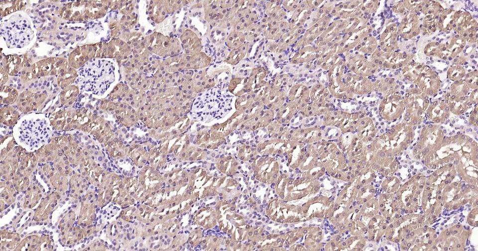 Paraformaldehyde-fixed, paraffin embedded Human Kidney; Antigen retrieval by boiling in sodium citrate buffer (pH6.0) for 15 min; Antibody incubation with ACLY Monoclonal Antibody, Unconjugated(bsm-52458R) at 1:200 overnight at 4°C, followed by conjugation to the SP Kit(Rabbit, SP-0023) and DAB (C-0010) staining.