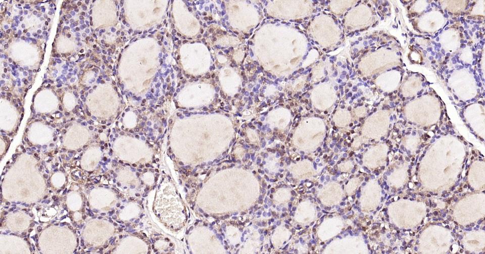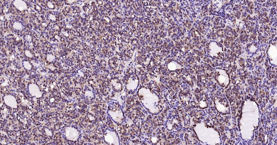 Paraformaldehyde-fixed, paraffin embedded Human Thyroid Gland; Antigen retrieval by boiling in sodium citrate buffer (pH6.0) for 15 min; Antibody incubation with ACLY Monoclonal Antibody, Unconjugated(bsm-52458R) at 1:200 overnight at 4°C, followed by conjugation to the SP Kit(Rabbit, SP-0023) and DAB (C-0010) staining.