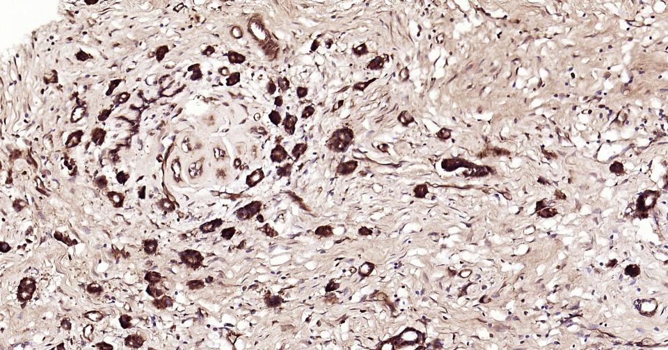 Paraformaldehyde-fixed, paraffin embedded Human Gastric Cancer; Antigen retrieval by boiling in sodium citrate buffer (pH6.0) for 15 min; Antibody incubation with ACLY Monoclonal Antibody, Unconjugated(bsm-52458R) at 1:200 overnight at 4°C, followed by conjugation to the SP Kit(Rabbit, SP-0023) and DAB (C-0010) staining.