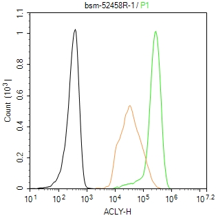 The Hela (H) cells were fixed with 4% PFA (10 min at r.t.) and then permeabilized with 90% ice-cold methanol for 20 min at -20℃,the cells then were incubated in 5%BSA to block non-specific protein-protein interactions (30 min at r.t.).Primary Antibody (green):Rabbit Anti-ACLY antibody (bsm-52458R,1:100); Isotype Control (orange): Rabbit IgG (bs-0295P). Blank control (black): PBS. Acquisition of 20,000 events was performed.