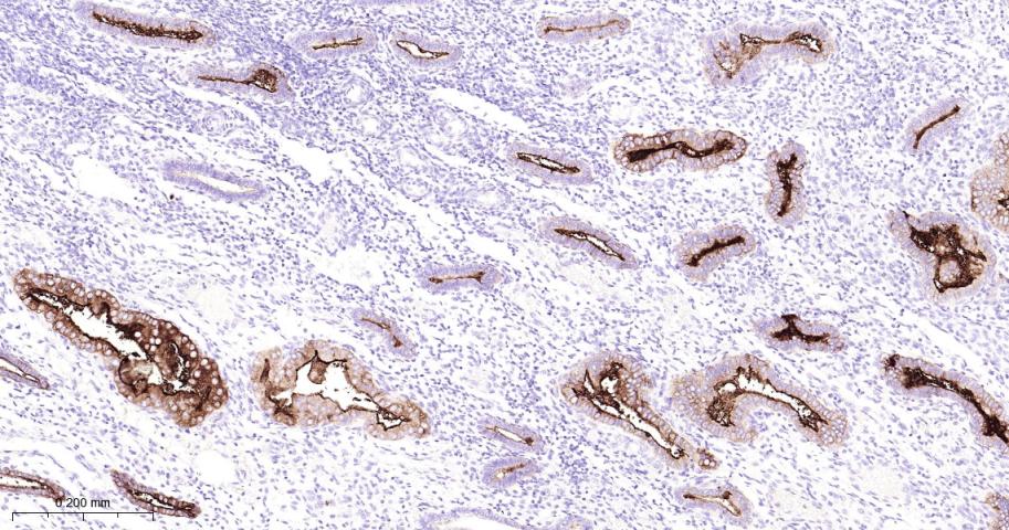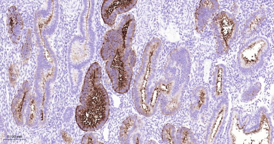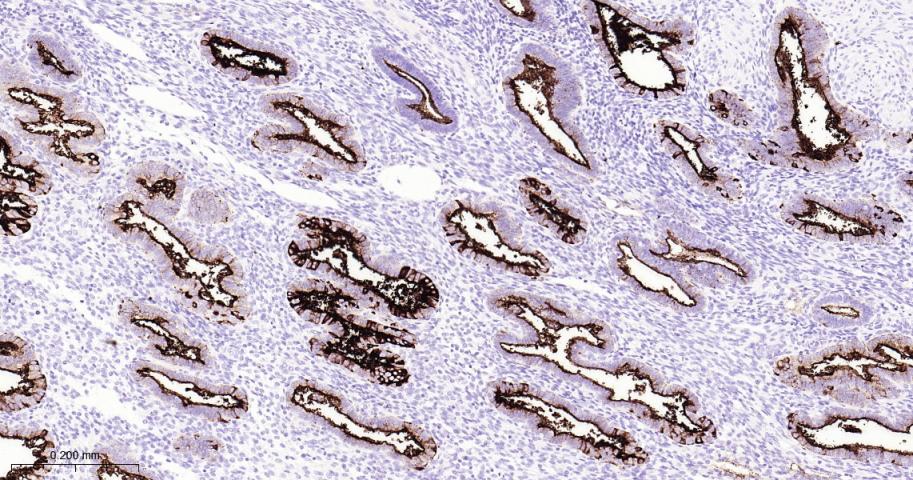 Paraformaldehyde-fixed, paraffin embedded Human Endometrial; Antigen retrieval by boiling in sodium citrate buffer (pH6.0) for 15 min; Antibody incubation with MUC16 Monoclonal Antibody, Unconjugated(bsm-43121M) at 1:200 overnight at 4°C, followed by conjugation to the bs-40296G-HRP and DAB (C-0010) staining.