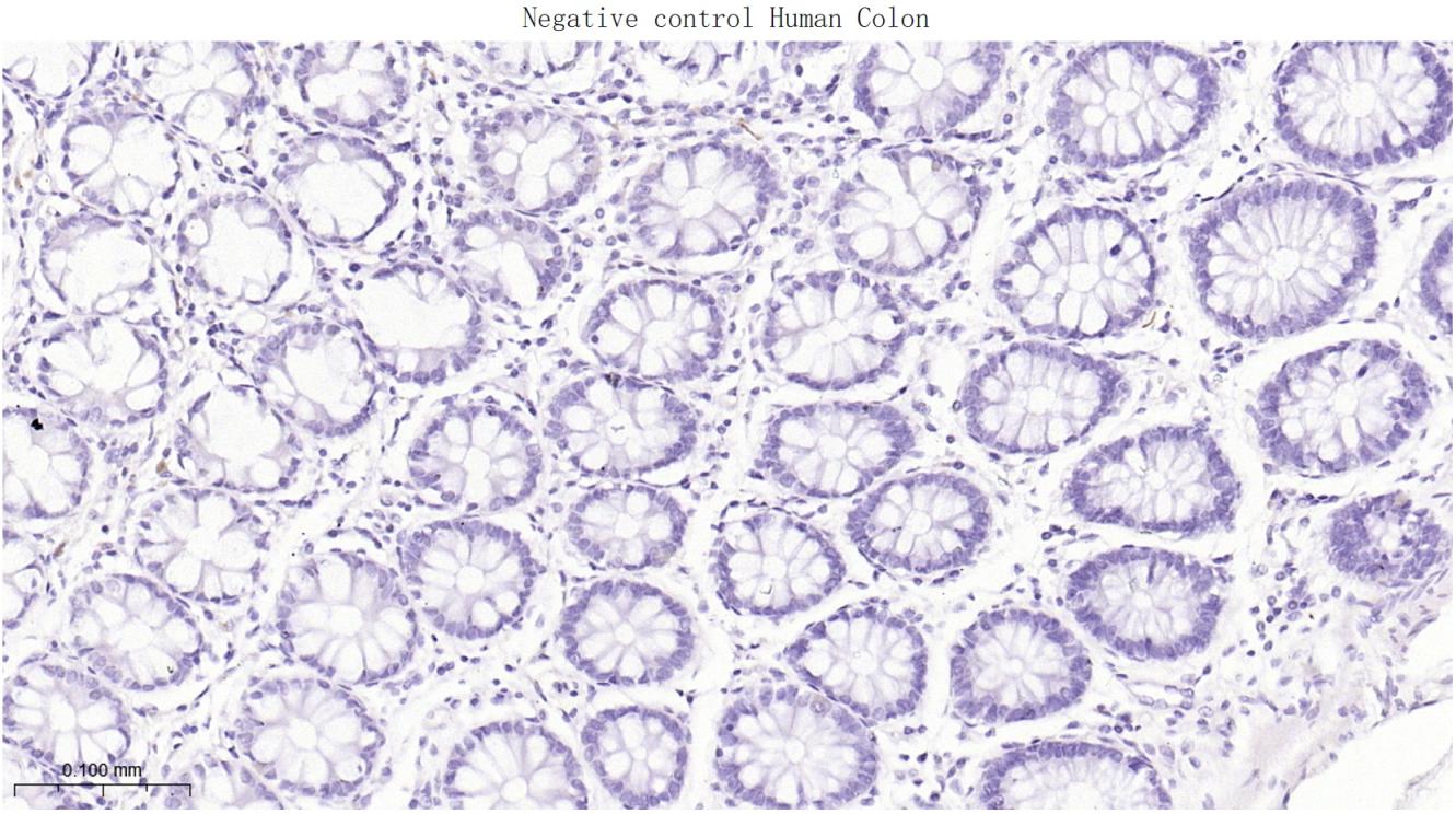 (Negative control)Paraformaldehyde-fixed, paraffin embedded Human Colon; Antigen retrieval by boiling in sodium citrate buffer (pH6.0) for 15 min; Antibody incubation with MUC16 Monoclonal Antibody, Unconjugated(bsm-43121M) at 1:200 overnight at 4°C, followed by conjugation to the bs-40296G-HRP and DAB (C-0010) staining.