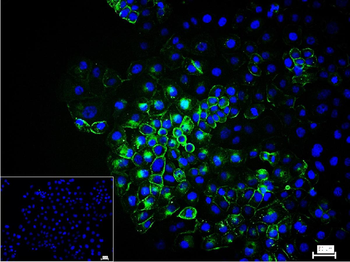 4% Paraformaldehyde-fixed OVCAR-3 (H) cell; Triton X-100 at r.t. for 20 min; Antibody incubation with (MUC16) monoclonal Antibody, unconjugated (bsm-43121M) 1:100, 90 min at 37°C; followed by conjugated Goat Anti-Mouse IgG antibody (green, bs-60296G-BF488) at 37°C for 90 min, DAPI (blue, C02-04002) was used to stain the cell nuclei. PBS instead of the primary antibody was used as the blank control.