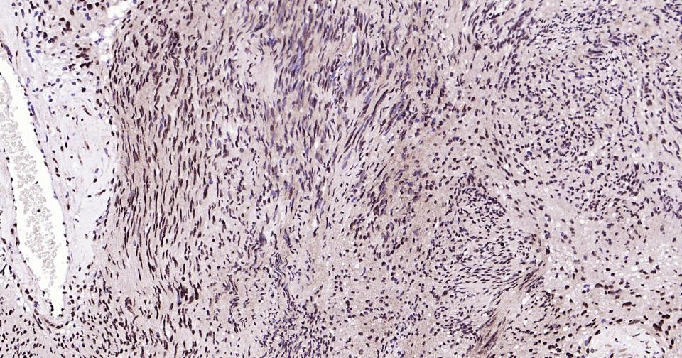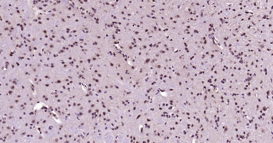 Paraformaldehyde-fixed, paraffin embedded Human Glioblastoma; Antigen retrieval by boiling in sodium citrate buffer (pH6.0) for 15 min; Antibody incubation with HES5 Monoclonal Antibody, Unconjugated(bsm-60648R) at 1:200 overnight at 4°C, followed by conjugation to the bs-0295G-HRP and DAB (C-0010) staining.