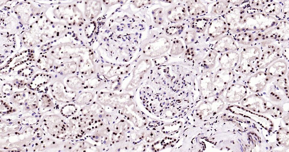 Paraformaldehyde-fixed, paraffin embedded Human Kidney; Antigen retrieval by boiling in sodium citrate buffer (pH6.0) for 15 min; Antibody incubation with HES5 Monoclonal Antibody, Unconjugated(bsm-60648R) at 1:200 overnight at 4°C, followed by conjugation to the bs-0295G-HRP and DAB (C-0010) staining.