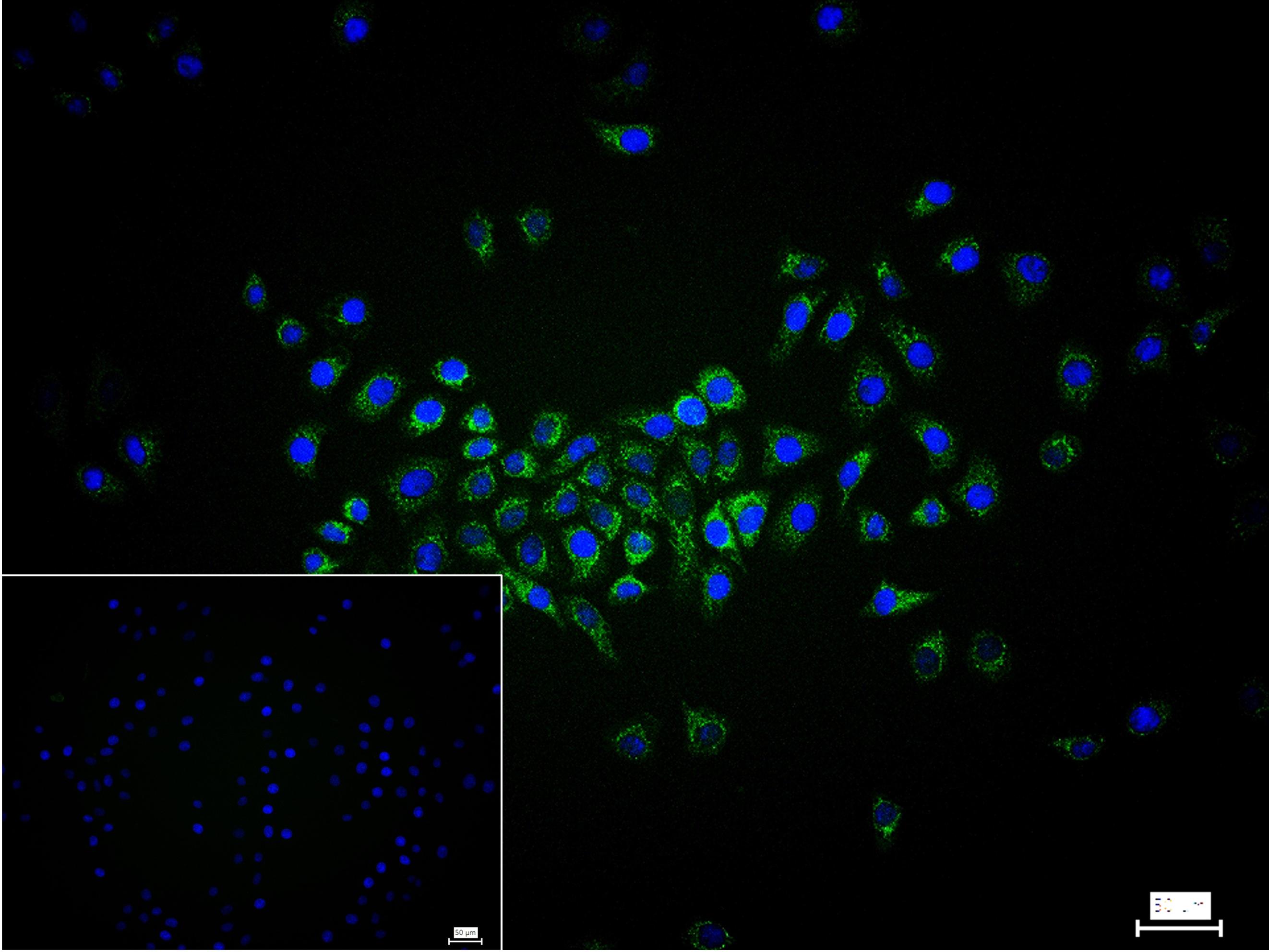 4% Paraformaldehyde-fixed HepG2 (H) cell; Triton X-100 at r.t. for 20 min; Antibody incubation with (PDHA1) monoclonal Antibody, unconjugated (bsm-60685R) 1:100, 90 min at 37°C; followed by conjugated Goat Anti-Rabbit IgG antibody (green, bs-60295G-BF488) at 37°C for 90 min, DAPI (blue, C02-04002) was used to stain the cell nuclei. PBS instead of the primary antibody was used as the blank control.