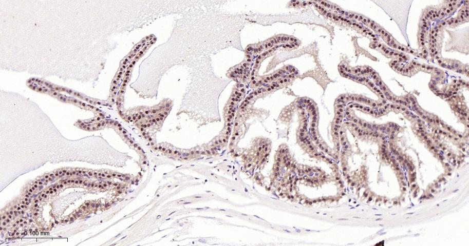 Paraformaldehyde-fixed, paraffin embedded Mouse Prostate; Antigen retrieval by boiling in sodium citrate buffer (pH6.0) for 15 min; The section was incubated with RBX1 Monoclonal Antibody, Unconjugated (bsm-60704R) at 1:200 overnight at 4°C, followed by conjugation to the bs-0295G-HRP and DAB (C-0010) staining.