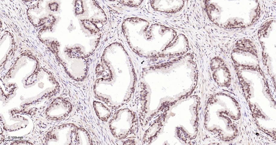 Paraformaldehyde-fixed, paraffin embedded Human Prostate; Antigen retrieval by boiling in sodium citrate buffer (pH6.0) for 15 min; The section was incubated with RBX1 Monoclonal Antibody, Unconjugated (bsm-60704R) at 1:200 overnight at 4°C, followed by conjugation to the bs-0295G-HRP and DAB (C-0010) staining.