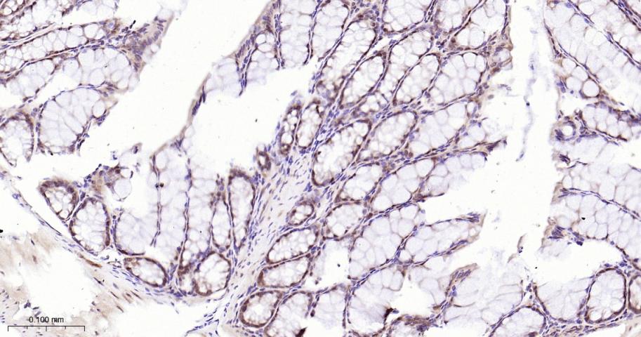 Paraformaldehyde-fixed, paraffin embedded Mouse Stomach; Antigen retrieval by boiling in sodium citrate buffer (pH6.0) for 15 min; The section was incubated with RBX1 Monoclonal Antibody, Unconjugated (bsm-60704R) at 1:200 overnight at 4°C, followed by conjugation to the bs-0295G-HRP and DAB (C-0010) staining.