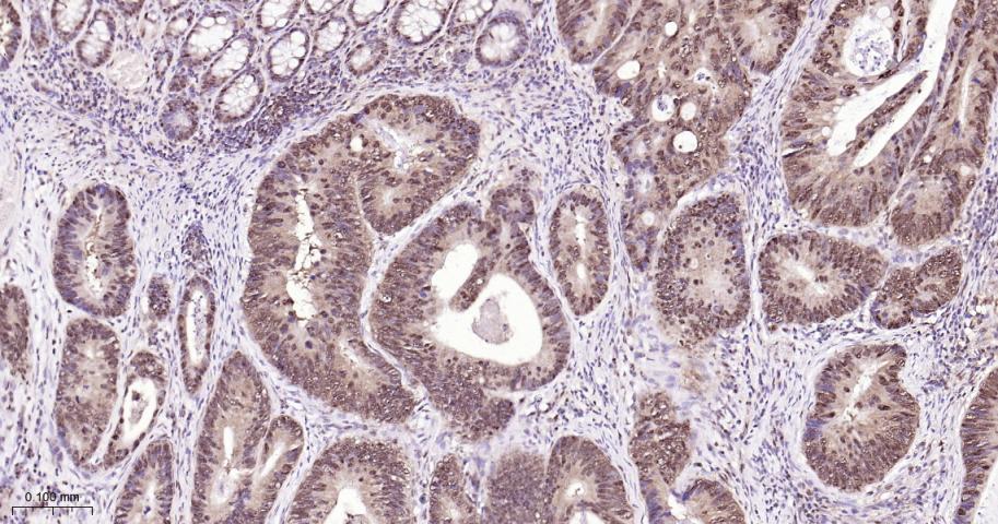 Paraformaldehyde-fixed, paraffin embedded Human Colon; Antigen retrieval by boiling in sodium citrate buffer (pH6.0) for 15 min; The section was incubated with RBX1 Monoclonal Antibody, Unconjugated (bsm-60704R) at 1:200 overnight at 4°C, followed by conjugation to the bs-0295G-HRP and DAB (C-0010) staining.