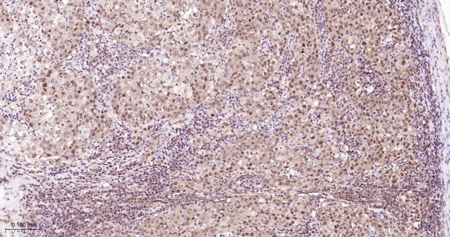 Paraformaldehyde-fixed, paraffin embedded Human Lung Cancer; Antigen retrieval by boiling in sodium citrate buffer (pH6.0) for 15 min; The section was incubated with RBX1 Monoclonal Antibody, Unconjugated (bsm-60704R) at 1:200 overnight at 4°C, followed by conjugation to the bs-0295G-HRP and DAB (C-0010) staining.