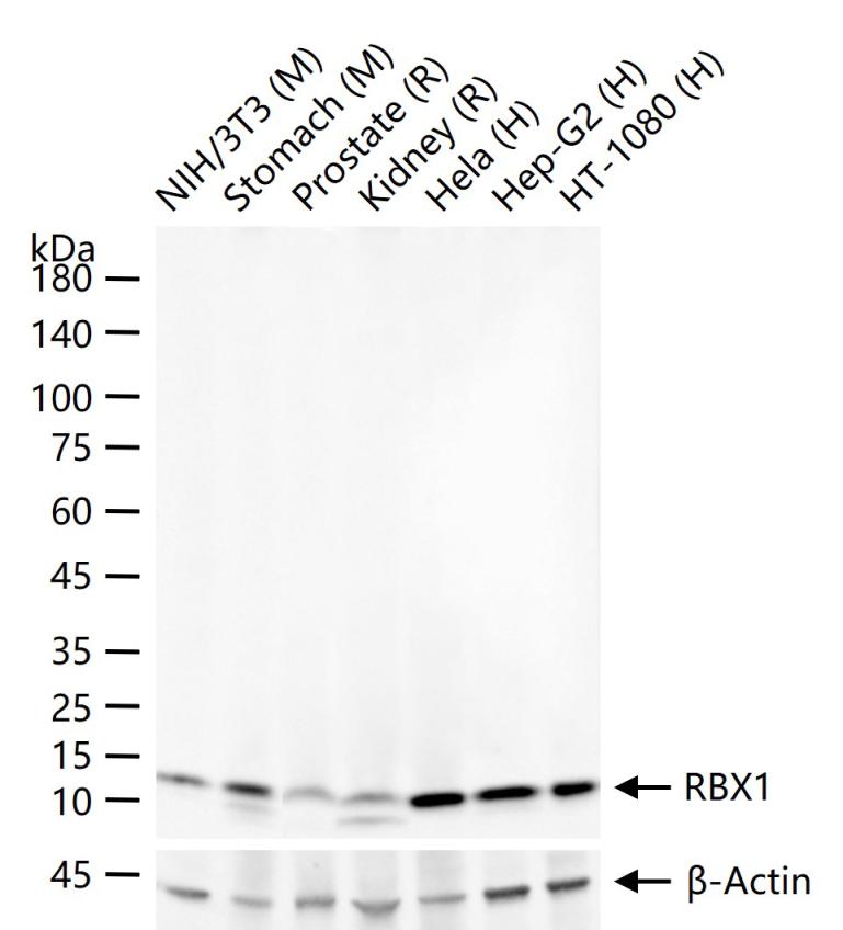 25 ug total protein per lane of various lysates (see on figure) probed with RBX1 monoclonal antibody, unconjugated (bsm-60704R) at 1:1000 dilution and 4°C overnight incubation. Followed by conjugated secondary antibody incubation at r.t. for 60 min.