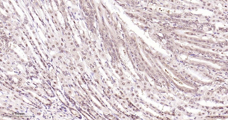 Paraformaldehyde-fixed, paraffin embedded Human Gastric Cancer; Antigen retrieval by boiling in sodium citrate buffer (pH6.0) for 15 min; The section was incubated with RBX1 Monoclonal Antibody, Unconjugated (bsm-60704R) at 1:200 overnight at 4°C, followed by conjugation to the bs-0295G-HRP and DAB (C-0010) staining.