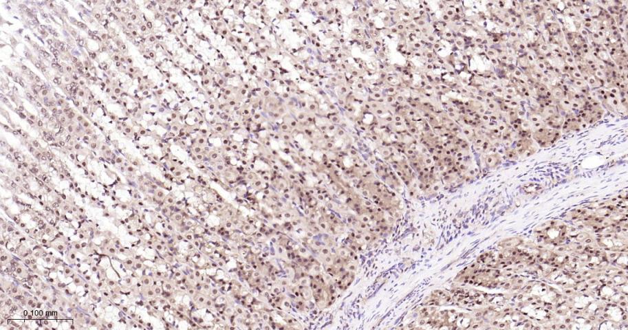 Paraformaldehyde-fixed, paraffin embedded Rat Stomach; Antigen retrieval by boiling in sodium citrate buffer (pH6.0) for 15 min; The section was incubated with RBX1 Monoclonal Antibody, Unconjugated (bsm-60704R) at 1:200 overnight at 4°C, followed by conjugation to the bs-0295G-HRP and DAB (C-0010) staining.