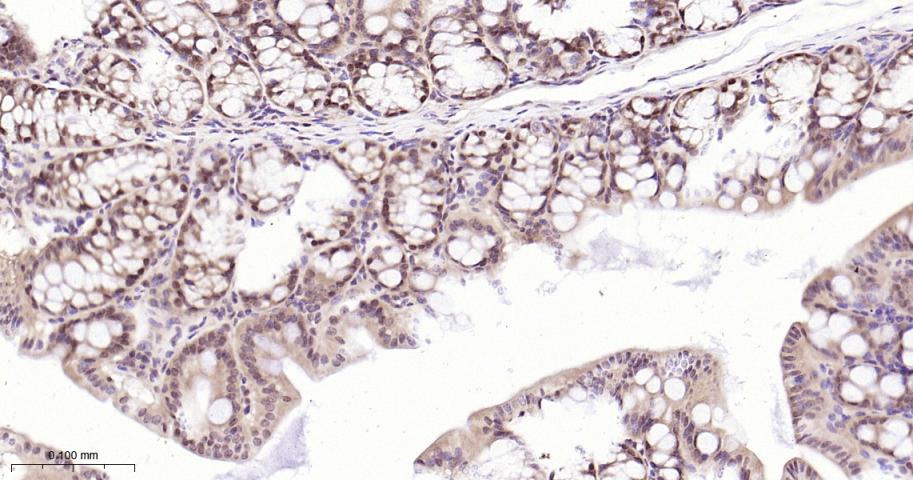 Paraformaldehyde-fixed, paraffin embedded Mouse Colon; Antigen retrieval by boiling in sodium citrate buffer (pH6.0) for 15 min; The section was incubated with RBX1 Monoclonal Antibody, Unconjugated (bsm-60704R) at 1:200 overnight at 4°C, followed by conjugation to the bs-0295G-HRP and DAB (C-0010) staining.