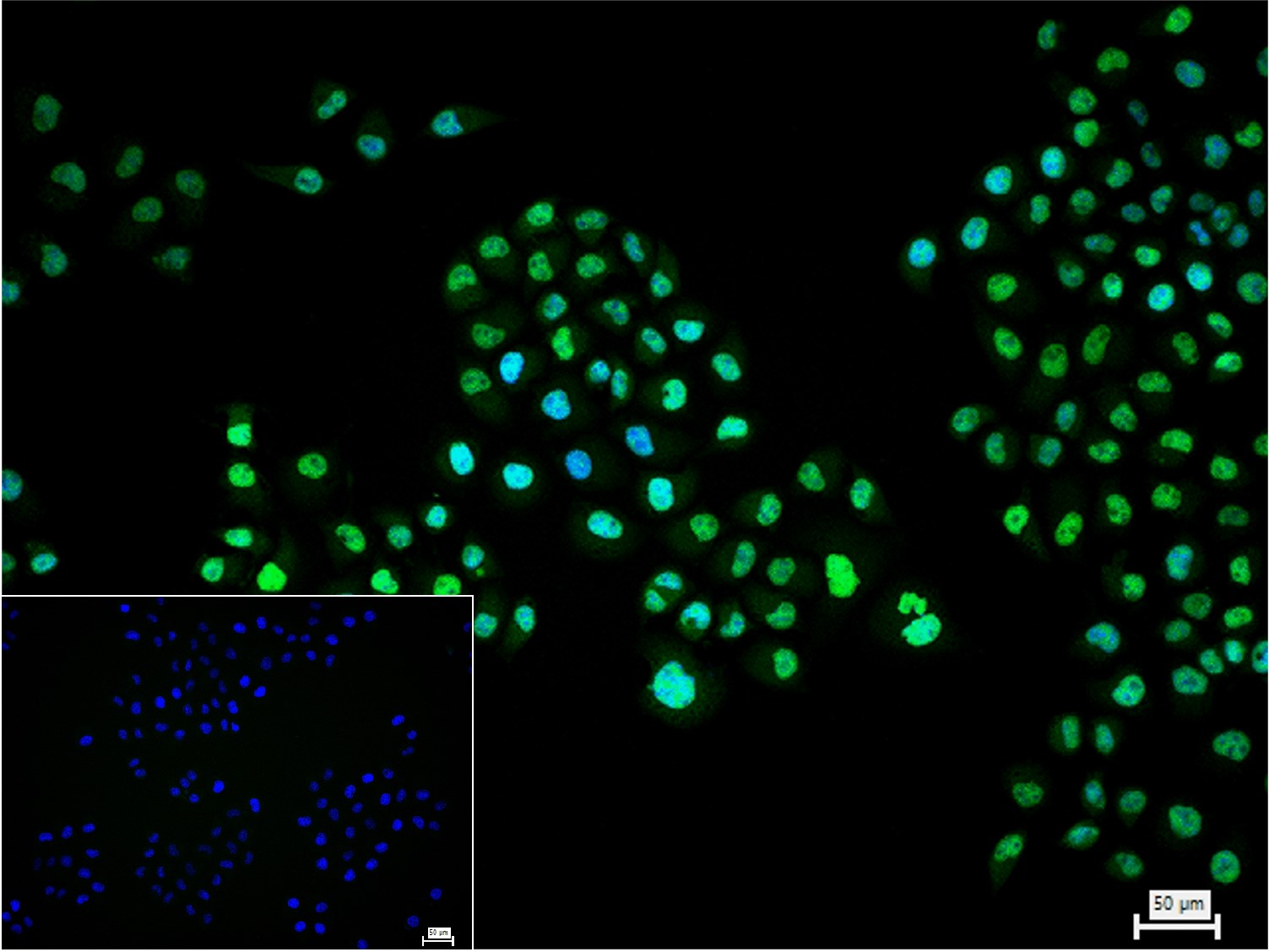 4% Paraformaldehyde-fixed Hela (H) cell; Triton X-100 at r.t. for 20 min; Antibody incubation with (CHD3) monoclonal Antibody, unconjugated (bsm-60708R) 1:100, 90 min at 37°C; followed by conjugated Goat Anti-Rabbit IgG antibody (green, bs-60295G-BF488) at 37°C for 90 min, DAPI (blue, C02-04002) was used to stain the cell nuclei. PBS instead of the primary antibody was used as the blank control.