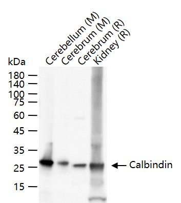 25 ug total protein per lane of various lysates (see on figure) probed with Calbindin monoclonal antibody, unconjugated (bsm-60713R) at 1:2000 dilution and 4°C overnight incubation. Followed by conjugated secondary antibody incubation at r.t. for 60 min.