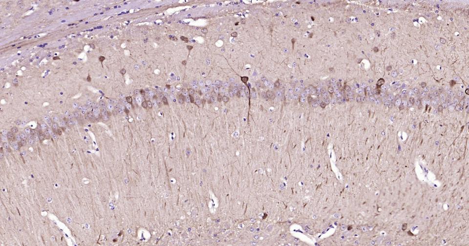 Paraformaldehyde-fixed, paraffin embedded Rat Cerebrum; Antigen retrieval by boiling in sodium citrate buffer (pH6.0) for 15 min; Antibody incubation with Calbindin Monoclonal Antibody, Unconjugated(bsm-60713R) at 1:200 overnight at 4°C, followed by conjugation to the bs-0295G-HRP and DAB (C-0010) staining.