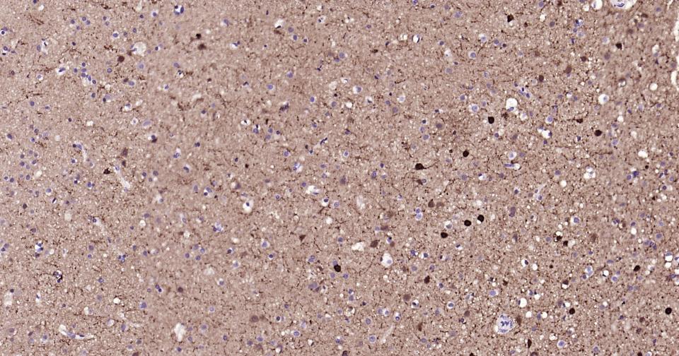 Paraformaldehyde-fixed, paraffin embedded Human Cerebrum; Antigen retrieval by boiling in sodium citrate buffer (pH6.0) for 15 min; Antibody incubation with Calbindin Monoclonal Antibody, Unconjugated(bsm-60713R) at 1:200 overnight at 4°C, followed by conjugation to the bs-0295G-HRP and DAB (C-0010) staining.
