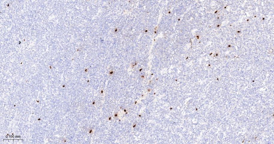 Paraformaldehyde-fixed, paraffin embedded Human Lymph; Antigen retrieval by boiling in sodium citrate buffer (pH6.0) for 15 min; The section was incubated with CMA1 Monoclonal Antibody, Unconjugated (bsm-54265R) at 1:200 overnight at 4°C, followed by conjugation to the bs-0295G-HRP and DAB (C-0010) staining.