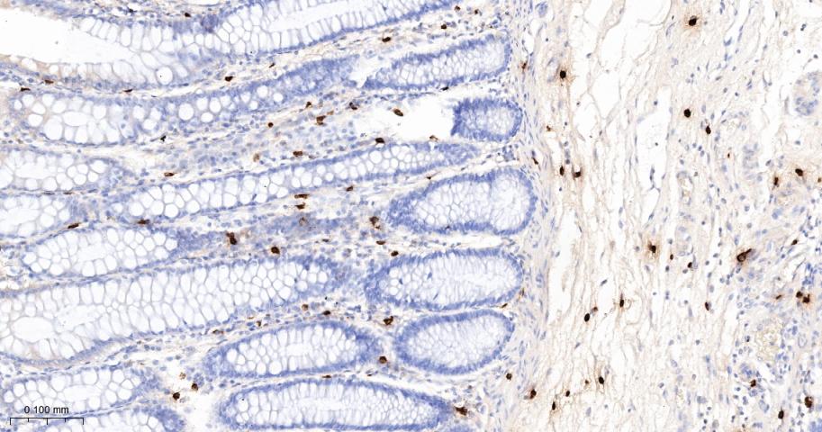 Paraformaldehyde-fixed, paraffin embedded Human Colon; Antigen retrieval by boiling in sodium citrate buffer (pH6.0) for 15 min; The section was incubated with CMA1 Monoclonal Antibody, Unconjugated (bsm-54265R) at 1:200 overnight at 4°C, followed by conjugation to the bs-0295G-HRP and DAB (C-0010) staining.