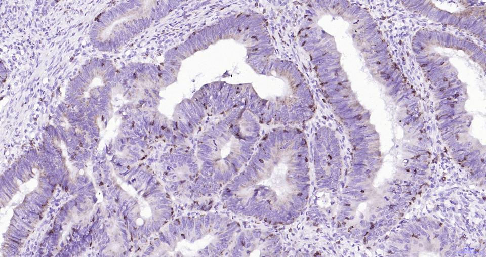 Paraformaldehyde-fixed, paraffin embedded (human colon cancer); Antigen retrieval by boiling in EDTA buffer (pH 9.0) for 15min; Block endogenous peroxidase by 3% hydrogen peroxide for 20 minutes; Blocking buffer (normal goat serum) at 37°C for 30min; Incubation with (CD8) Monoclonal Antibody, Unconjugated (bsm-60735R) at 1:200 overnight at 4°C, followed by operating according to SP Kit(Rabbit) (sp-0023)instructionsand DAB staining.