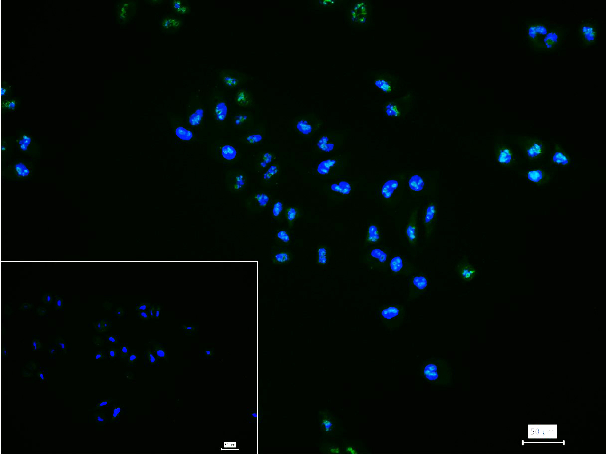 4% Paraformaldehyde-fixed Hela(H) cell; Triton X-100 at r.t. for 20 min; Antibody incubation with (Ki-67) monoclonal Antibody, unconjugated (bsm-60738R) 1:200, 90 min at 37°C; followed by conjugated Goat Anti-Rabbit IgG antibody (green, bs-0295G-FITC) at 37°C for 90 min, DAPI (blue, C02-04002) was used to stain the cell nuclei. PBS instead of the primary antibody was used as the blank control.