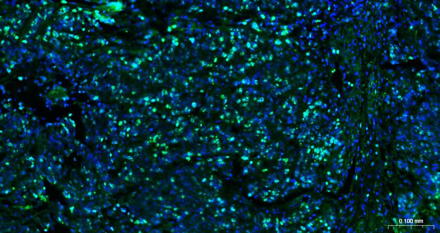 Paraformaldehyde-fixed, paraffin embedded Human Esophageal Cancer; Antigen retrieval by boiling in sodium citrate buffer (pH6.0) for 15 min; Antibody incubation with Ki67 Monoclonal Antibody, Unconjugated (bsm-60738R) at 1:200 overnight at 4°C. Followed by conjugated Goat Anti-Rabbit IgG antibody (green, bs-0295G-BF488), DAPI (blue, C02-04002) was used to stain the cell nuclei.