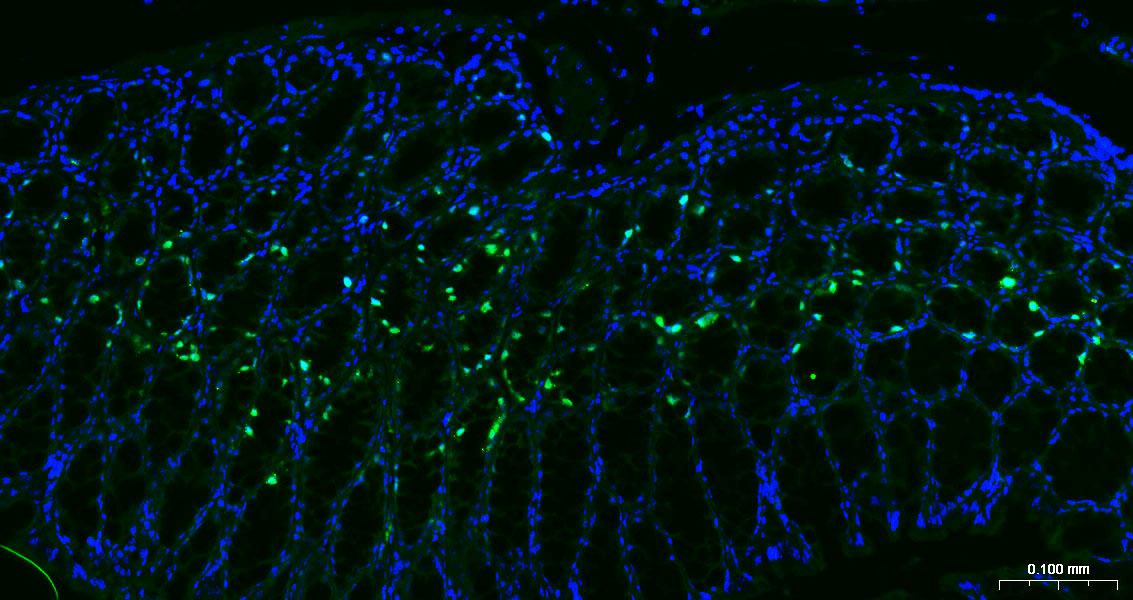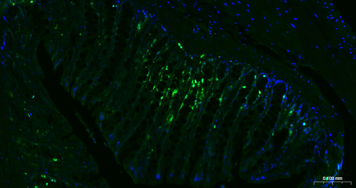 Paraformaldehyde-fixed, paraffin embedded Mouse Colon; Antigen retrieval by boiling in sodium citrate buffer (pH6.0) for 15 min; Antibody incubation with Ki67 Monoclonal Antibody, Unconjugated (bsm-60738R) at 1:200 overnight at 4°C. Followed by conjugated Goat Anti-Rabbit IgG antibody (green, bs-0295G-BF488), DAPI (blue, C02-04002) was used to stain the cell nuclei.