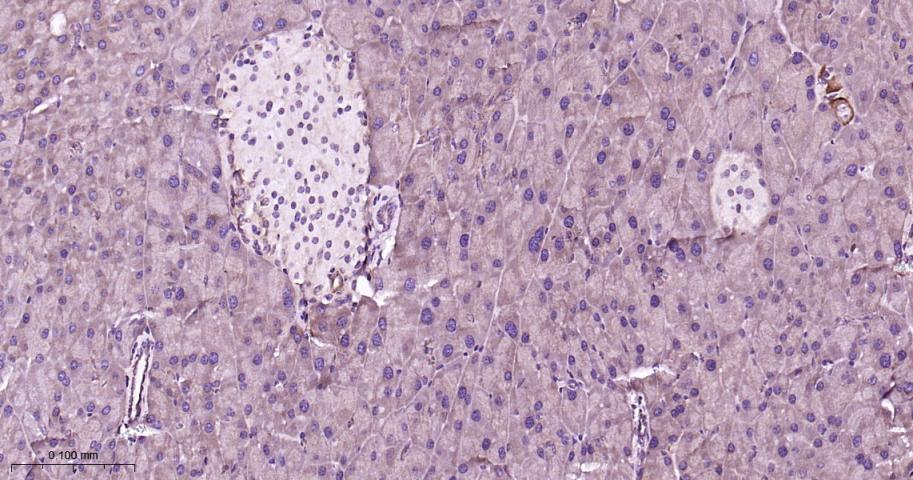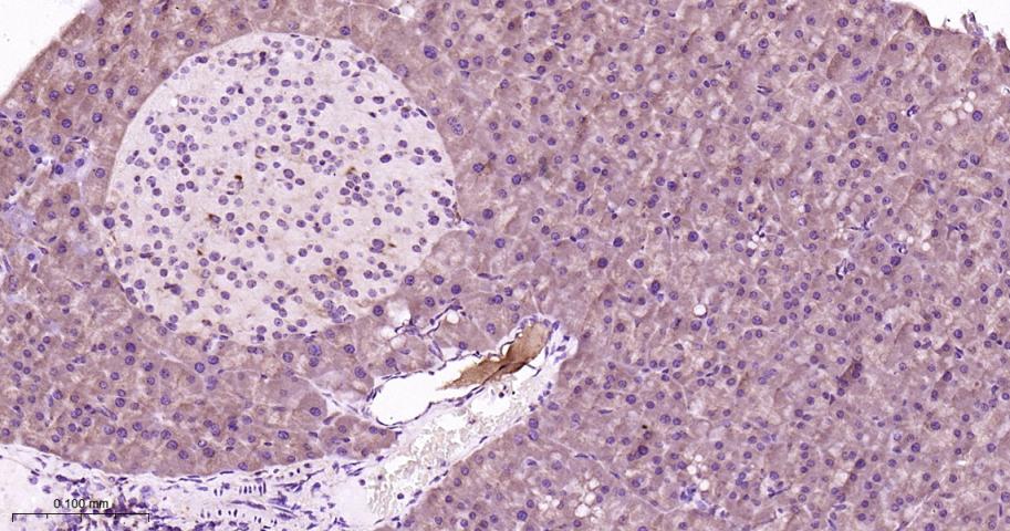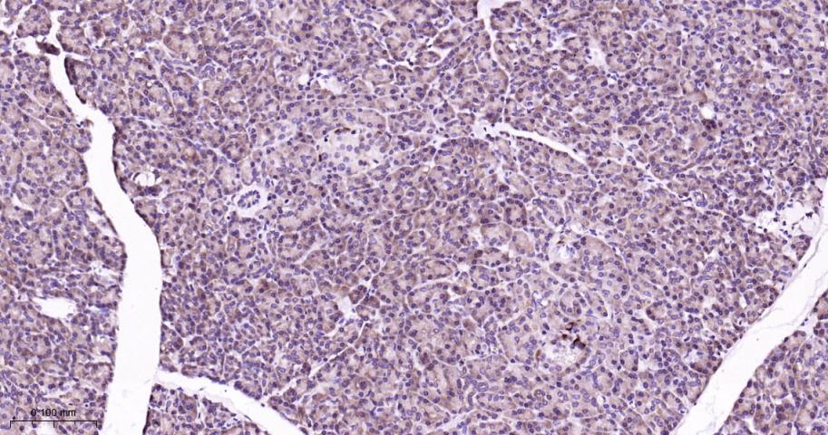 Paraformaldehyde-fixed, paraffin embedded Mouse Pancreas; Antigen retrieval by boiling in sodium citrate buffer (pH6.0) for 15 min; Antibody incubation with MEK1 Monoclonal Antibody, Unconjugated(bsm-60744R) at 1:200 overnight at 4°C, followed by conjugation to the bs-0295G-HRP and DAB (C-0010) staining.