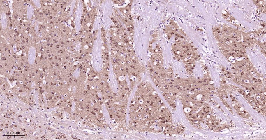 Paraformaldehyde-fixed, paraffin embedded Human Cerebrum; Antigen retrieval by boiling in sodium citrate buffer (pH6.0) for 15 min; Antibody incubation with MEK1 Monoclonal Antibody, Unconjugated(bsm-60744R) at 1:200 overnight at 4°C, followed by conjugation to the bs-0295G-HRP and DAB (C-0010) staining.