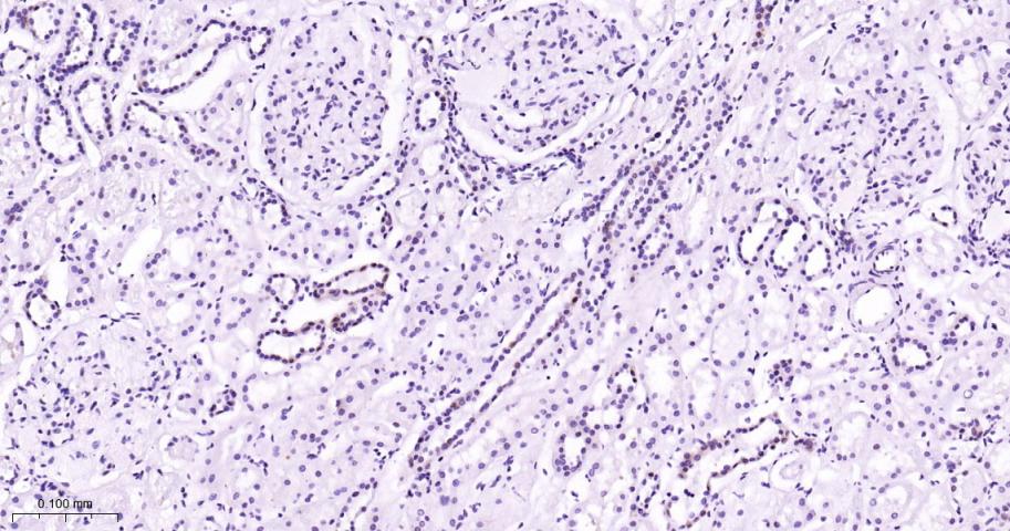 Paraformaldehyde-fixed, paraffin embedded Human Kidney; Antigen retrieval by boiling in sodium citrate buffer (pH6.0) for 15 min; Antibody incubation with MEK1 Monoclonal Antibody, Unconjugated(bsm-60744R) at 1:200 overnight at 4°C, followed by conjugation to the bs-0295G-HRP and DAB (C-0010) staining.