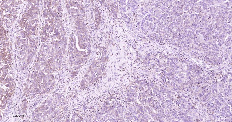 Paraformaldehyde-fixed, paraffin embedded Human Ovarian Cancer; Antigen retrieval by boiling in sodium citrate buffer (pH6.0) for 15 min; Antibody incubation with MEK1 Monoclonal Antibody, Unconjugated(bsm-60744R) at 1:200 overnight at 4°C, followed by conjugation to the bs-0295G-HRP and DAB (C-0010) staining.