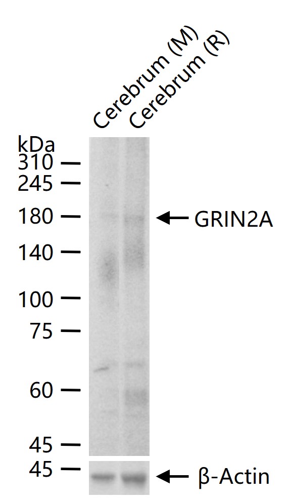 25 ug total protein per lane of various lysates (see on figure) probed with GRIN2A monoclonal antibody, unconjugated (bsm-54048R) at 1:500 dilution and 4°C overnight incubation. Followed by conjugated secondary antibody incubation at r.t. for 60 min.
