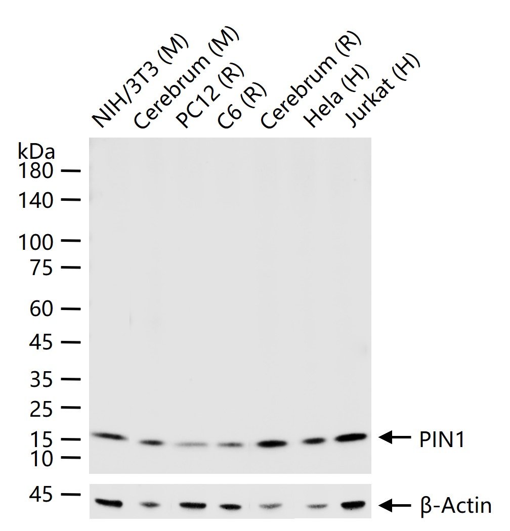 25 ug total protein per lane of various lysates (see on figure) probed with PIN1 monoclonal antibody, unconjugated (bsm-51230M) at 1:1000 dilution and 4°C overnight incubation. Followed by conjugated secondary antibody incubation at r.t. for 60 min.