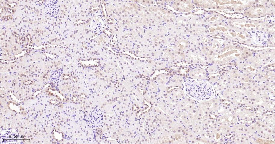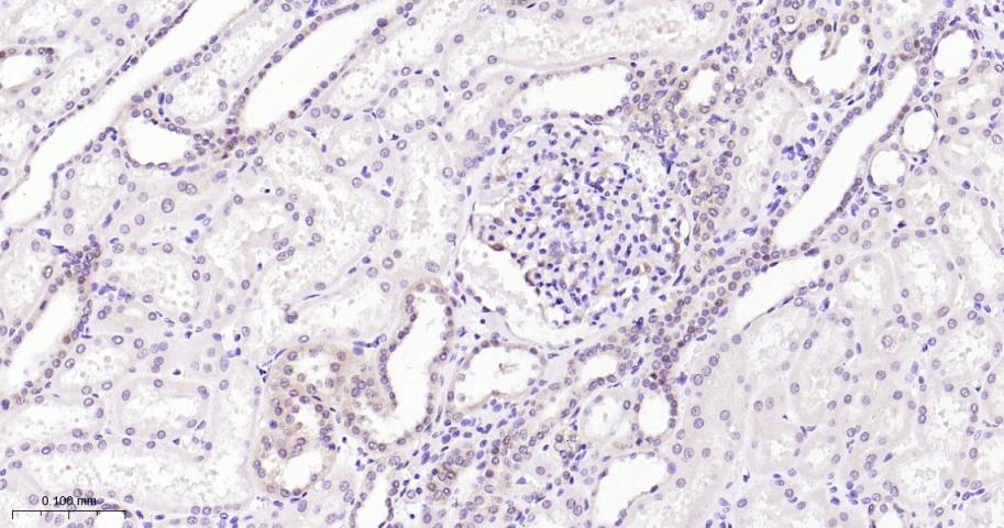 Paraformaldehyde-fixed, paraffin embedded Rat Kidney; Antigen retrieval by boiling in sodium citrate buffer (pH6.0) for 15 min; The section was incubated with PIN1 Monoclonal Antibody, Unconjugated (bsm-51230M) at 1:200 overnight at 4°C, followed by conjugation to the bs-40296G-HRP and DAB (C-0010) staining.