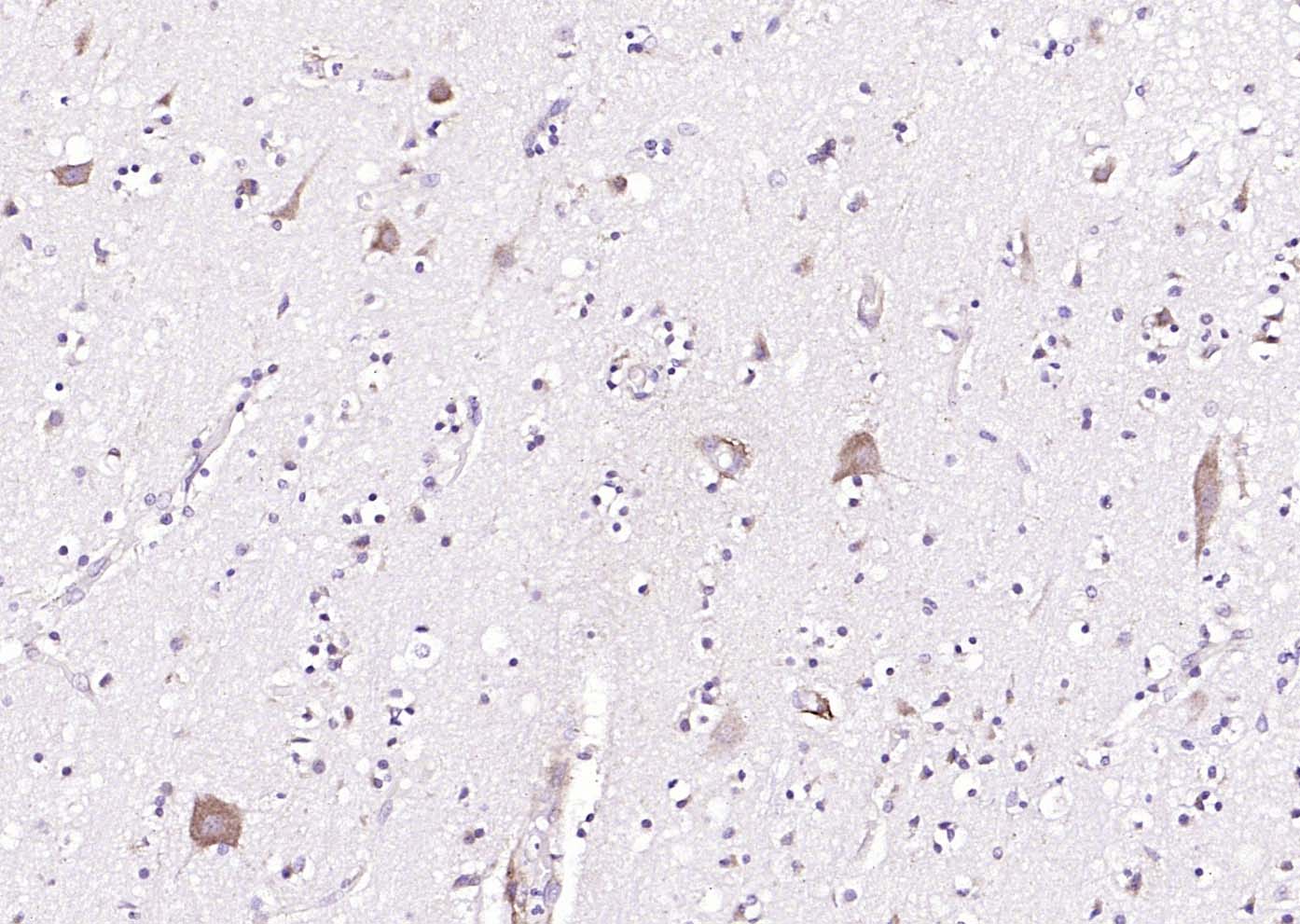 Paraformaldehyde-fixed, paraffin embedded (human brain); Antigen retrieval by boiling in sodium citrate buffer (pH6.0) for 15min; Block endogenous peroxidase by 3% hydrogen peroxide for 20 minutes; Blocking buffer (normal goat serum) at 37°C for 30min; Incubation with (FMN1) Polyclonal Antibody, Unconjugated (bs-25423R) at 1:200 overnight at 4°C, followed by operating according to SP Kit(Rabbit) (sp-0023) instructionsand DAB staining.