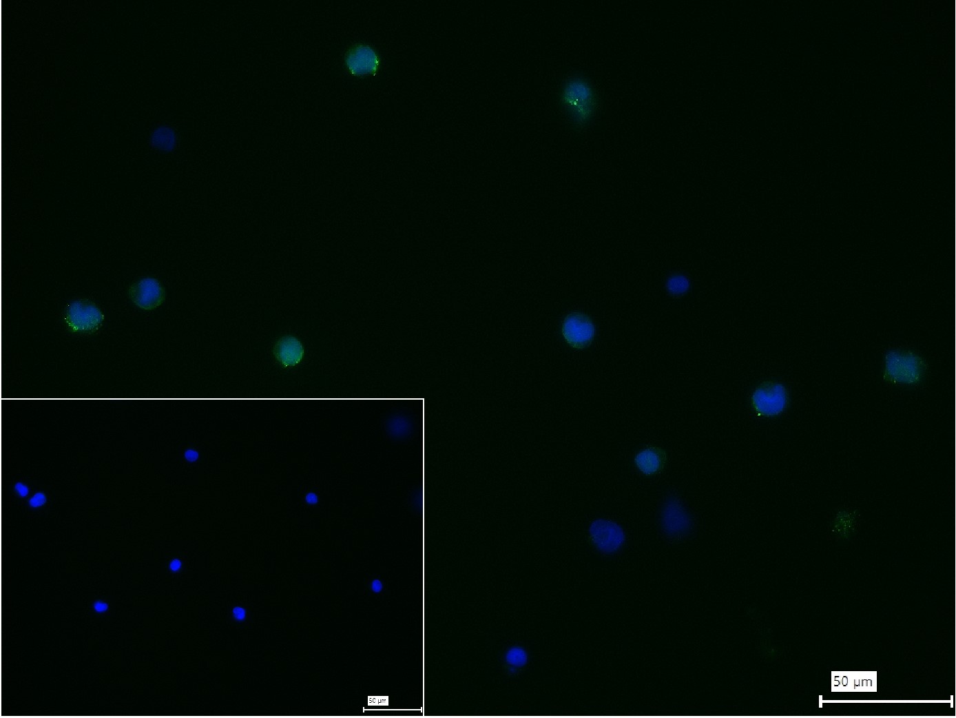 4% Paraformaldehyde-fixed Molt-4 (H) cell; Triton X-100 at r.t. for 20 min; Antibody incubation with (MRC1) monoclonal Antibody, unconjugated (bsm-60761R) 1:100, 90 min at 37°C; followed by conjugated Goat Anti-Rabbit IgG antibody (green, bs-60295G-FITC) at 37°C for 90 min, DAPI (blue, C02-04002) was used to stain the cell nuclei. PBS instead of the primary antibody was used as the blank control.